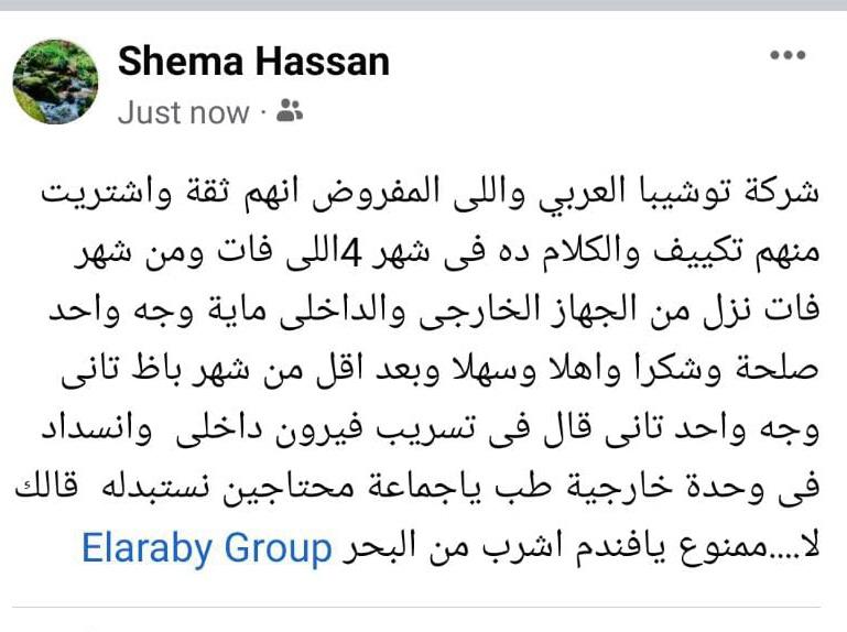 وقال صاحب المشكلة، عبر صفحته الرسمية بموقع التواصل الاجتماعي فيس بوك،"شركة توشيبا العربي واللي المفروض انهم ثقة واشتريت منهم تكييف والكلام ده في شهر 4 اللي فات ومن شهر فات نزل من الجهاز الخارجي والداخلي ماية وجه واحد صلحة وشكرا واهلا وسهلا.