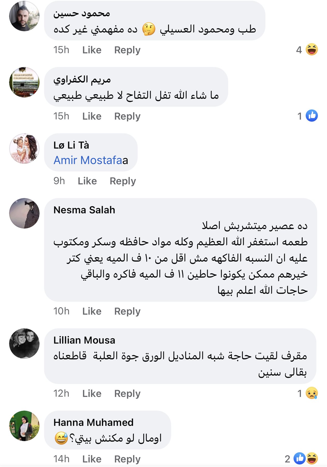 وتفاعل شخص أخر قائلا،"ده عصير ميتشربش اصلا طعمه استغفر الله العظيم وكله مواد حافظه وسكر ومكتوب عليه ان النسبه الفاكههمش اقل من 10 ف الميه يعني كتر خيرهم ممكن يكونوا حاطين 11 ف الميه فاكره والباقي حاجات الله اعلم بيها”