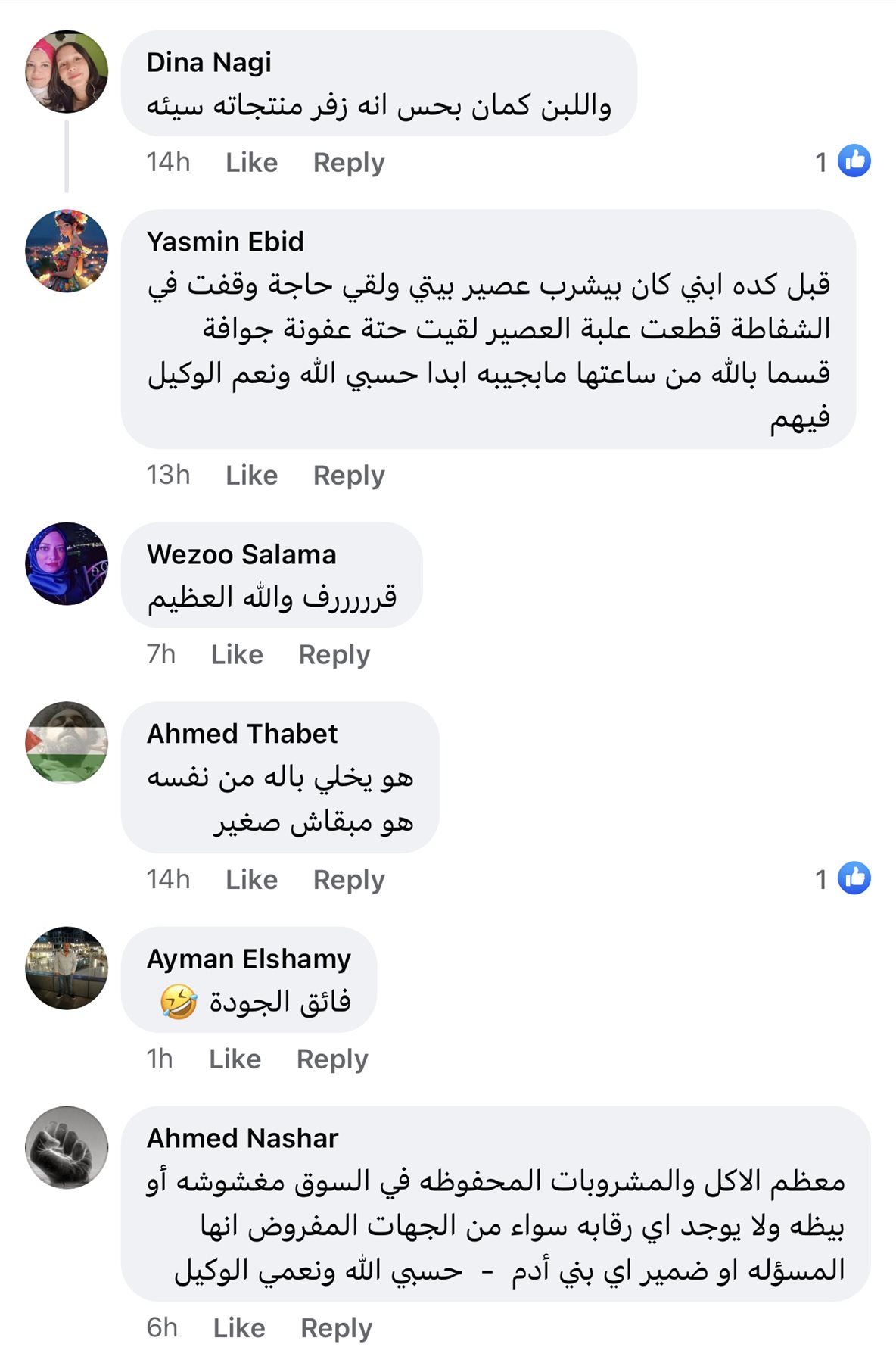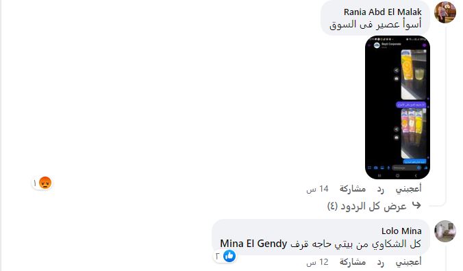 وتفاعلت سيدة أخري محذرة من المنتج،" قبل كده ابني كان بيشرب عصير بيتي ولقي حاجة وقفت في الشفاطة قطعت علبة العصير لقيتحتة عفونة جوافة قسما بالله من ساعتها مابجيبه ابدا حسبي الله ونعم الوكيل فيهم".