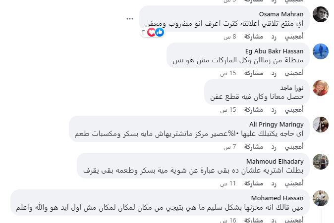 وتابع أخر،" اى حاجه يكتبلك عليها ١٠%عصير مركز ماتشتريهاش مايه بسكر ومكسبات طعم"، وتابع أخر ،" حد يمنشن لمحمود العسيلي بقي".