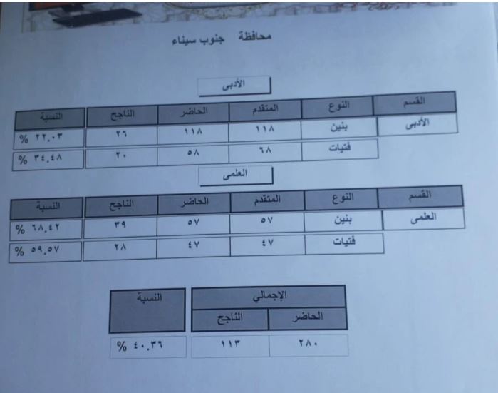 وتقدم للامتحان 280 طالبا في شعبتي الأدبي والعلمي، وبلغت نسبة النجاح 40،36 %، وتقدم في شعبة الأدبي 118 طالبا نجح منهم 26، وبلغت نسبة النجاح 22،03%، وفي شعبة الأدبي بنات تقدم 58 طالبة، نجحت 20 فقط بنسبة 34،48%.