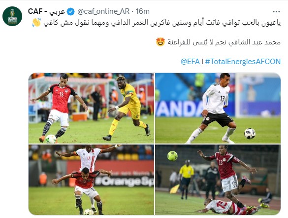 وكتب الحساب الرسمي للاتحاد الإفريقي عبر صفحته على موقع التواصل الاجتماعي تويتر: "يا عيون بالحب توافي فاتت أيام وسنين فاكرين العمر الدافي ومهما نقول مش كافي.. محمد عبد الشافي نجم لا يُنسى للفراعنة".