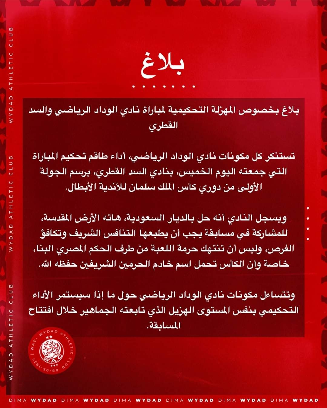 ونشر الوداد البيضاوي المغربي بيًانا رسميا عبر حسابه الرسمي على موقع التواصل الاجتماعي فيسبوك: بلاغ بخصوص المهزلة التحكيمية لمباراة نادي الوداد الرياضي والسد القطري، وتستنكر كل مكونات نادي الوداد الرياضي، أداء طاقم تحكيم المباراة التي جمعته اليوم الخميس، بنادي السد القطري، برسم الجولة الأولى من دوري كأس الملك سلمان للأندية الأبطال.