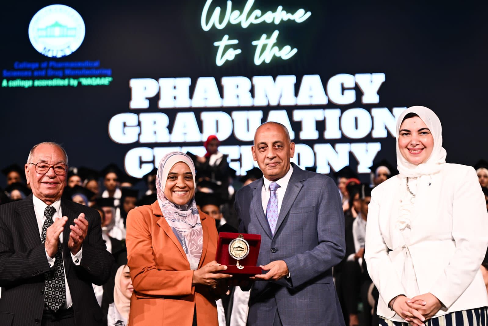 وعلى هامش الحفل كرمت جامعة مصر للعلوم والتكنولوجيا الدكتورة نجوى هاشم وكيل نقابة الصيادلة بالجيزة، والتى قامت بتلاوة القسم للخريجين وقاموا بترديد القسم ورائها.