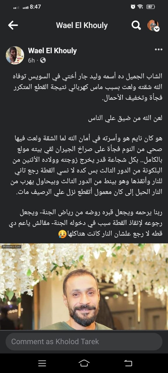 وكتب أحد جيرانه بالمنطقة منشور:" الشاب الجميل ده أسمه وليد جار أختي في السويس توفاه الله شقته ولعت بسبب ماس كهربائي نتيجة القطع المتكرر فجأة وتخفيف الأحمال".