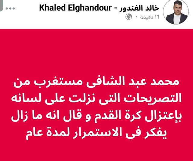 وكتب خالد الغندور عبر صفحته على موقع التواصل الإجتماعي "فيسبوك": "محمد عبد الشافي مستغرب من التصريحات التي نزلت علي لسانه بإعتزال كرة القدم و قال انه ما زال يفكر في الاستمرار لمدة عام".