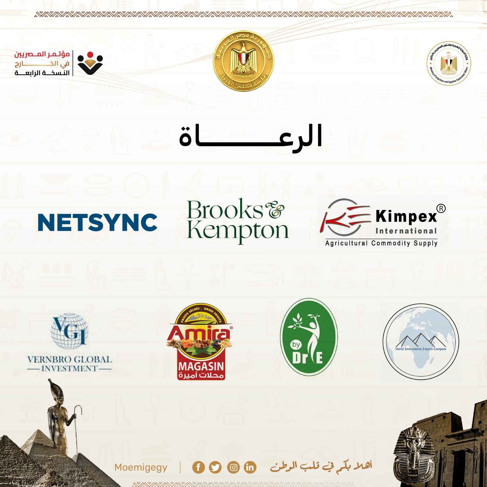 تعلن وزارة الدولة للهجرة وشئون المصريين بالخارج، رعاة النسخة الرابعة من مؤتمر "المصريين في الخارج"، تحت رعاية السيد رئيس مجلس الوزراء الدكتور مصطفى مدبولي، ومنها بنك ناصر الاجتماعي التابع لوزارة التضامن الاجتماعي، كأحد الرعاة الرئيسيين للمؤتمر، وكذلك شركات فيرن برو جلوبال لرجل الأعمال المصري بالخارج أشرف دوس، وشركة نت سينك نتوورك سيلوشنز لرجل الأعمال المصري بالخارج المهندس تامر هدايت، شركة كيمبكس kempex international وشركة kempton ltd& Brooks لرجل الأعمال المصري بالخارج كريم أسعد، شركة أميرة للمنتجات الغذائية لرجل الأعمال المصري عادل بولس، شركة world environment expert company لرجل الأعمال المصري وائل حسن، كذلك شركة DR E لرجل الأعمال المصري ابراهيم عزت، وجميعها شركات لكبار رجال أعمال ومستثمرين مصريين بالخارج.