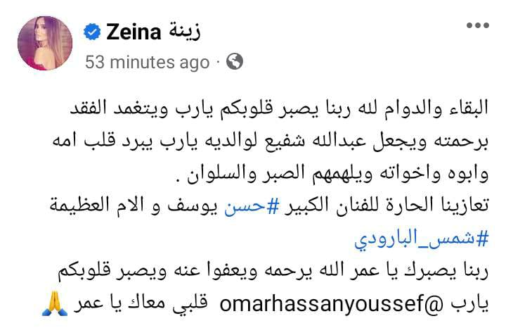 وكتبت زينة:" البقاء والدوام لله ربنا يصبر قلوبكم يارب ويتغمد الفقد برحمته ويجعل عبدالله شفيع لوالديه يارب يبرد قلب امه وابوه واخواته ويلهمهم الصبر والسلوان . تعازينا الحارة للفنان الكبير حسن يوسف و الام العظيمة شمس البارودي ربنا يصبرك يا عمر الله يرحمه ويعفوا عنه ويصبر قلوبكم يارب قلبي معاك يا عمر".