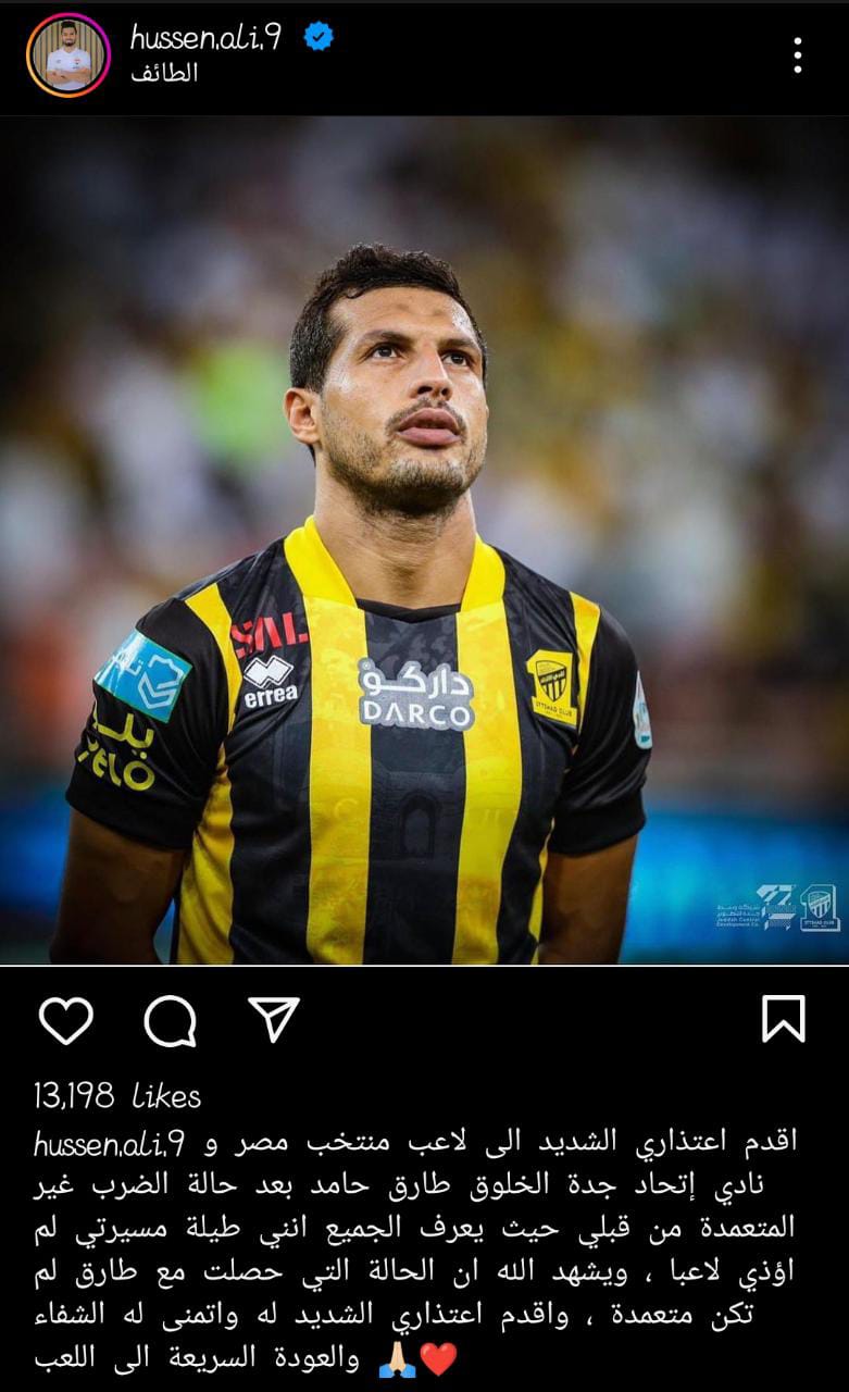 وكتب حسين علي عبر صفحته على موقع تبادل الصور والفيديوهات "انستجرام": "اقدم اعتذاري الشديد الى لاعب منتخب مصر ونادي إتحاد جدة الخلوق طارق حامد بعد حالة الضرب غير المتعمدة من قبلي حيث يعرف الجميع انني طيلة مسيرتي لم اؤذي لاعبا".