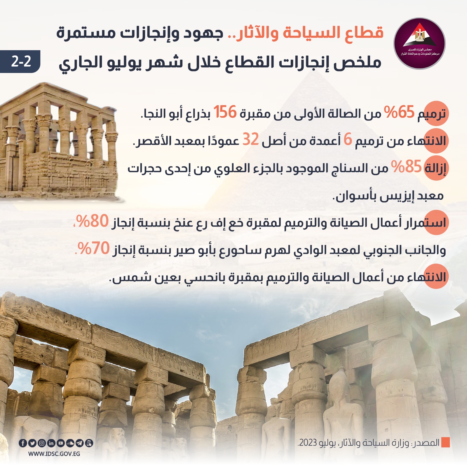 فالعمل داخل القطاع يتم بفاعلية ويسير وفق الخطط المتفق عليها، فخلال شهر يوليو 2023 فقط، تم الكشف عن جبانة من عهد الملك أحمس بأبيدوس، واسترداد رأس تمثال للملك رمسيس الثاني من سويسرا بعد خروجها من مصر بطريقة غير شرعية منذ أكثر من 30 عامًا، وتم الانتهاء من عدد من المشروعات وجاهزيتها للافتتاح؛ منها: معبد بن عذرا اليهودي وحصن بابليون بمنطقة مصر القديمة، وجامع الأقمر بشارع المعز، وتم ترميم الناحية الجنوبية من معبد الكرنك، ومعبد الملك ستي الأول بالقرنة، فضلا عن ترميم 65% من الصالة الأولى من مقبرة 156 بذراع أبوالنجا، والانتهاء من ترميم 6 من أصل 32 عمودًا بمعبد الأقصر، كما تمت إزالة 85% من السناج الموجود بالجزء العلوي من إحدى حجرات معبد إيزيس بأسوان، وغيرها من الإنجازات.