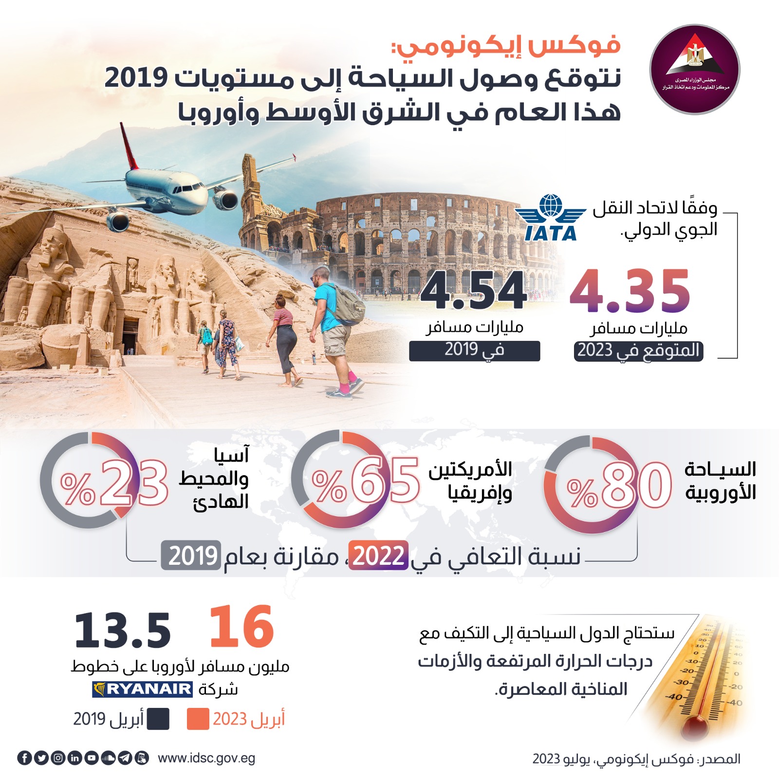 وعلى المستوى العالمي؛ تتوقع فوكس إيكونومي أن تتعافى السياحة العالمية من الأزمات المتعددة والمتلاحقة التي أعادت تحديد أولويات المسافرين وتغييرهم للوجهات؛ فوفقا لاتحاد النقل الجوي الدولي؛ متوقع وفود 4.35 مليارات مسافر في 2023، مقارنة بنحو 4.54 مليارات مسافر في 2019، وعليه تتوقع فوكس إيكونومي 80% تعافي في السياحة الأوروبية في 2022، مقارنة بعام 2019، و65% تعافي في السياحة في الأمريكتين وإفريقيا، و23% في آسيا والمحيط الهادي.