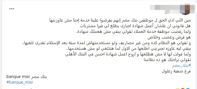 وثقت سيدة تجربتها مع بنك مصر بعد إجبار موظفة بالبنك لها على فتح فيزا مشتريات لعمل شهادة إدخار ، وقالت السيدة،" مين اللي ادي الحق ل موظفين بنك مصر إنهم يفرضوا علينا خدمة إحنا مش عاوزينها هل قانوني ان علشان أعمل شهادة اجبارى يطلع لي فيزا مشتريات".