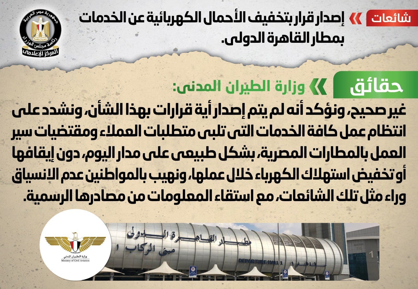 قام المركز الإعلامي لمجلس الوزراء بالتواصل مع وزارة الطيران المدني، والتي نفت تلك الأنباء، مُؤكدةً أنه لا صحة لتخفيف الأحمال الكهربائية عن أي من الخدمات بمطار القاهرة الدولي، وأنه لم يتم إصدار أية قرارات بهذا الشأن، مُشددةً على انتظام عمل كافة الخدمات التي تلبي متطلبات العملاء ومقتضيات سير العمل بالمطارات المصرية، بشكل طبيعي على مدار اليوم، دون إيقافها أو تخفيض استهلاك الكهرباء خلال عملها، مُهيبةً بالمواطنين عدم الانسياق وراء مثل تلك الشائعات، مع استقاء المعلومات من مصادرها الرسمية.