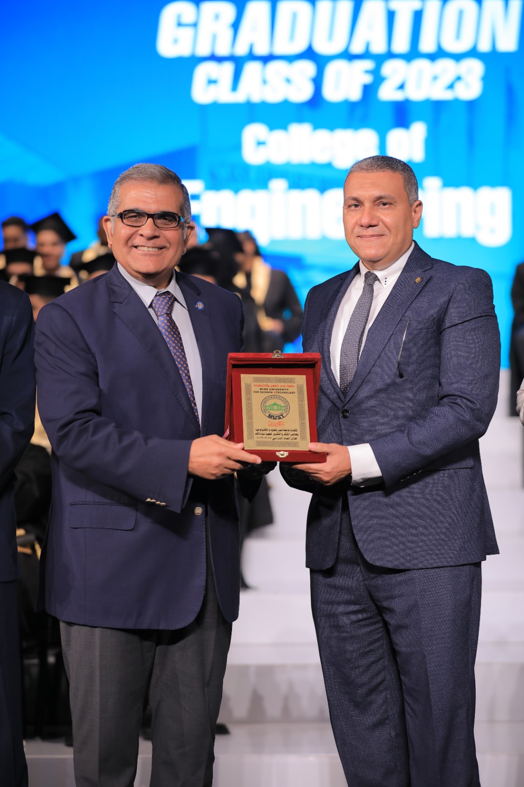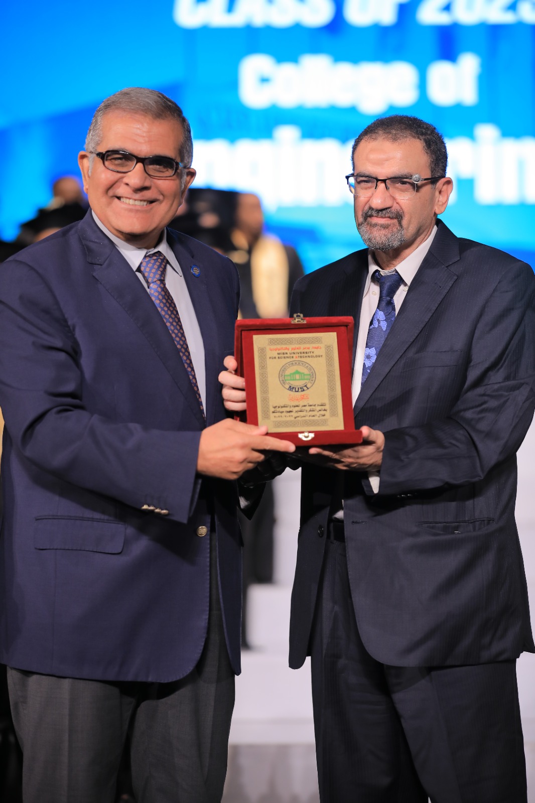وقال الدكتور أشرف حيدر رئيس جامعة مصر للعلوم والتكنولوجيا، إننا نشهد هذه الأيام أجمل الاحتفالات بأبنائنا الطلاب، مضيفاً :"الحقيقة كل حاجة في الدنيا لها شكل هندسي وجميع العلوم لها ابعاد هندسية ومن هنا بدأ اخطر شيء حدث في العشرات سنوات الاخيرة وهي الثورة الصناعية الرابعة، كما أن لهم الشرف أن تمتلك الجامعة خريجون من أعظم المهندسين ولديهم منطق في التفكير بين العلاقة الهندسية والعلوم المختلفة يستطيعون من خلالها أن يكونوا قادرين على أن يكونوا أصحاب ريادة أعمال لا ينتظرون المهنة بل هو من يبدعونها."