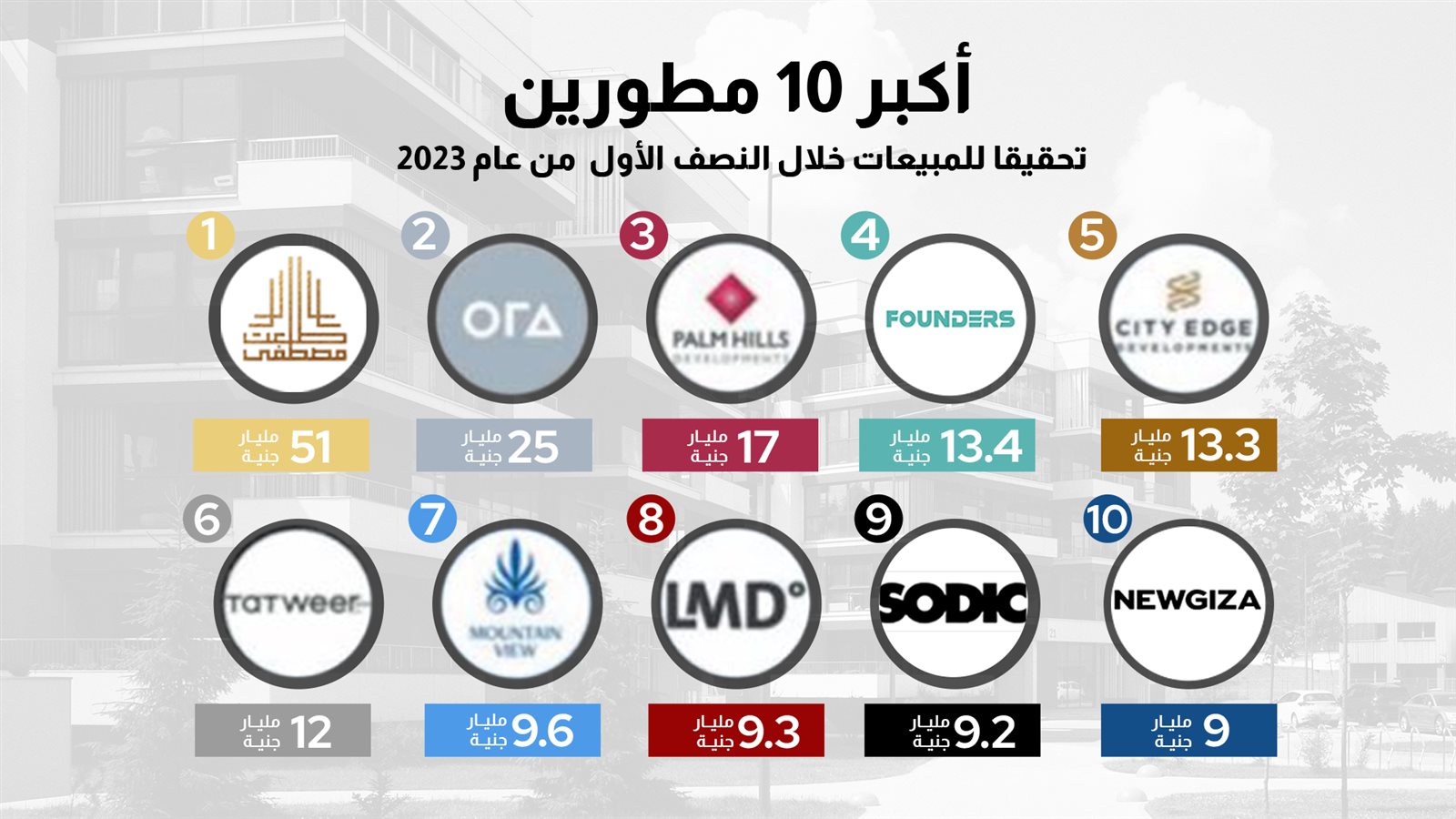 وحققت أكبر 10 شركات عقارية في مصر مبيعات بلغت 168 مليار جنيه خلال النصف الأول من عام 2023 بنسبة نمو 88% مقارنة بالفترة المماثلة من العام الماضي.
