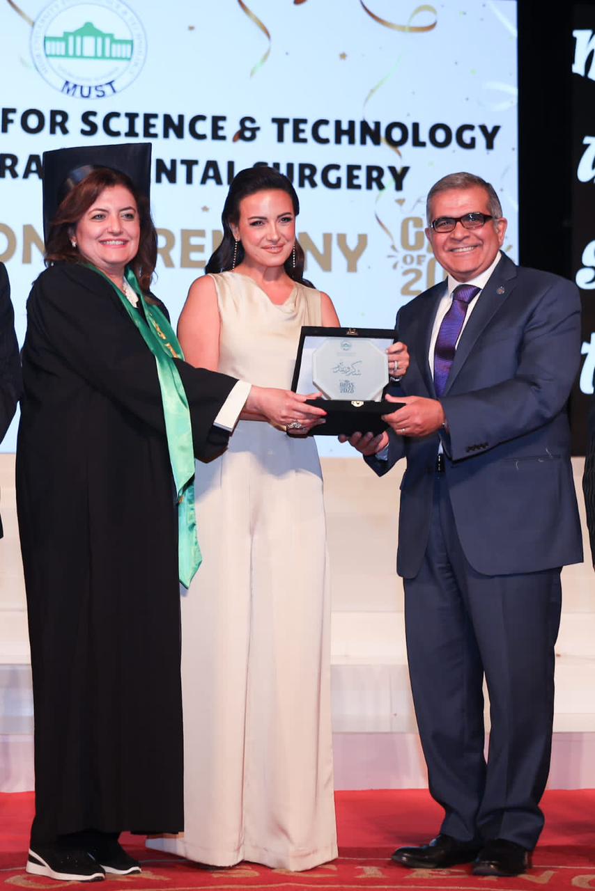 وشهد الحفل تكريم الفنانة ريهام عبد الغفور، بدرع جامعة مصر للعلوم والتكنولوجيا، معربة عن سعادتها الشديدة بالتكريم، وقامت بتهنئة الطلاب قائلة :"ألف مبروك لكل الطلبة وأول حاجة كنت أتمني اني أعملها في حياتي هي دخولى كلية طب أسنان لكن ما كنتش شاطرة فكنت أدبي وربنا يحقق لكم كل أحلامكم إن شاء الله"، وتضمن الحفل فقرة خاصة تحدث فيها الطلاب الوافدين بكلية طب الاسنان جامعة مصر للعلوم والتكنولوجيا، مؤكدين مدى الدعم الكامل الذى تمتعوا به طوال فترة الدراسة، وتأهيلهم بشكل مميز لسوق العمل المحلى والدولى من مصر أم الدنيا، مشيرين إلى مدى سعادتهم بالدراسة في جامعة مصر للعلوم والتكنولوجيا.