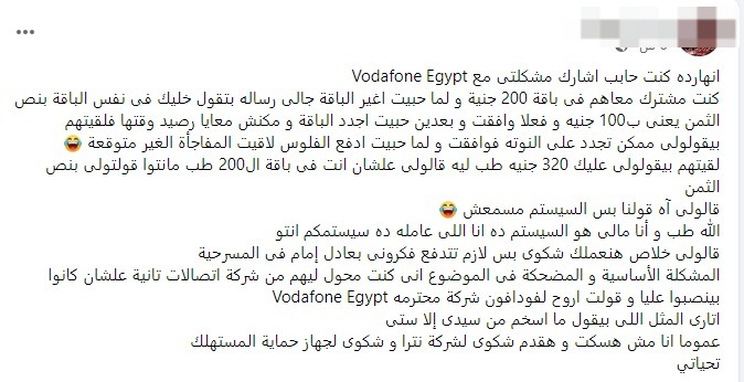 حذر مواطن من شركة فودافون والتعامل معها بسبب سرقتها للعميل ، على حد قوله ، مستعرضا مشكلته قائلا "انهارده كنت حابب اشارك مشكلتى مع Vodafone Egypt كنت مشترك معاهم فى باقة 200 جنية و لما حبيت اغير الباقة جالى رساله بتقول خليك فى نفس الباقة بنص الثمن يعنى ب100 جنيه و فعلا وافقت و بعدين حبيت اجدد الباقة و مكنش معايا رصيد وقتها فلقيتهم بيقولولى ممكن تجدد على النوته فوافقت و لما حبيت ادفع الفلوس لاقيت المفاجأة الغير متوقعة".
