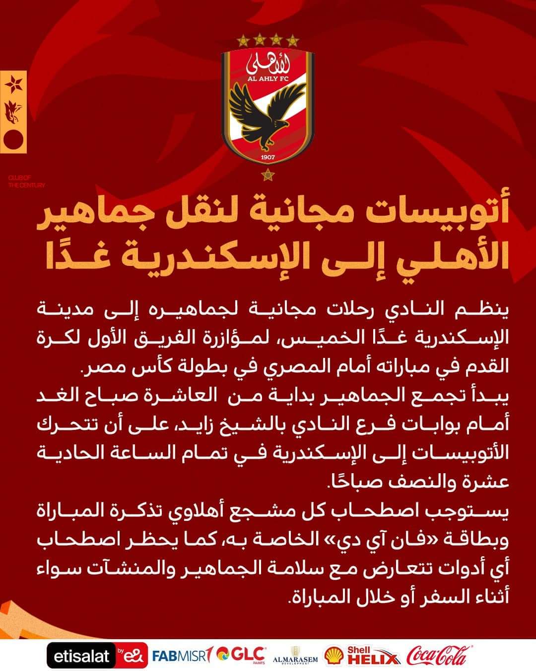 قرر مجلس إدارة النادي الأهلي بقيادة الكابتن محمود الخطيب، توفير أتوبيسات مجانية لنقل جماهير القلعة الحمراء إلى الأسكندرية لمتابعة مباراة فريقهم أمام المصري غداً ضمن منافسات بطولة كأس مصر.