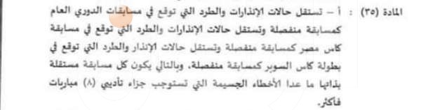 "تستقل حالات الإنذارات والطرد التي توقع في مسابقات الدوري العام كمسابقة منفصلة وتستقل حالات الإنذارات والطرد التي توقع في مسابقة كأس مصر كمسابقة منفصلة وتستقل حالات الإنذارات والطرد التي توقع في مسابقة كأس السوبر كمسابقة منفصلة، وبالتالي يكون كل مسابقة مستقلة بذاتها ما عدا الأخطاء الجسيمة التي تستوجب جزاء تأديبي (8) مباريات فأكثر".