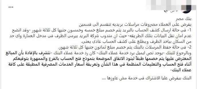 حذر مواطن من التعاملات مع بنك مصر لفرضه مصروفات مراسلات على العملاء ، وقال صاحب الشكوي ، "يفرض على العملاء مصروفات مراسلات بريديه تنقسم الى قسمين فى حالة ارسال كشف الحساب بالبريد يتم خصم مبلغ خمسه وخمسون جنيها كل ثلاثة شهور -وقد اتضح عدم امان نقل البيانات بتلك الطريقه- حيث ان مندوب شركة البريد بيرمى الظرف فى مدخل العمارة واى حد من السكان بياخد الظرف ويطلع على كشف الحساب عادى يعنى.