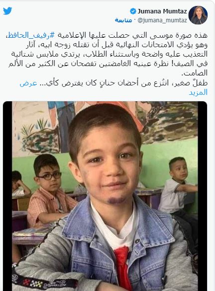 وتداولت مواقع التواصل الاجتماعي صورة تفطر القلب للطفل الضحية حصلت عليها إعلامية عراقية، تظهر موسى وهو يؤدي الامتحانات النهائية قبل أن تقتله زوجة أبيه.