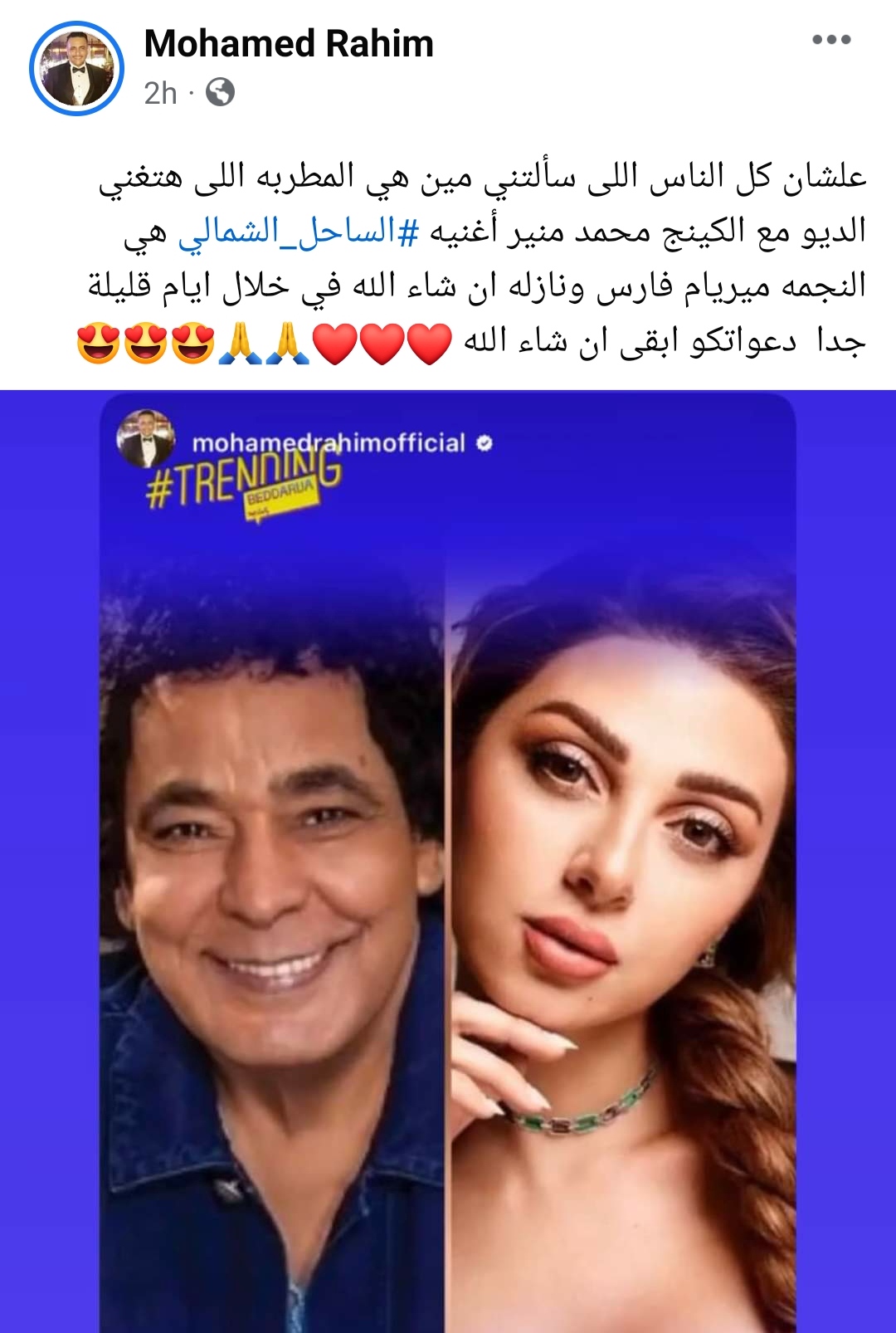 وكتب محمد رحيم، عبر حسابه الشخصي على موقع التواصل الاجتماعي "فيسبوك"، قائلًا: "علشان كل الناس اللى سألتني مين هي المطربة اللى هتغني الديو مع الكينج محمد منير.. أغنيه الساحل الشمالي.. هي النجمة ميريام فارس.. ونازلة إن شاء الله في خلال أيام قليلة جدًا.. دعواتكوا بقى إن شاء الله".