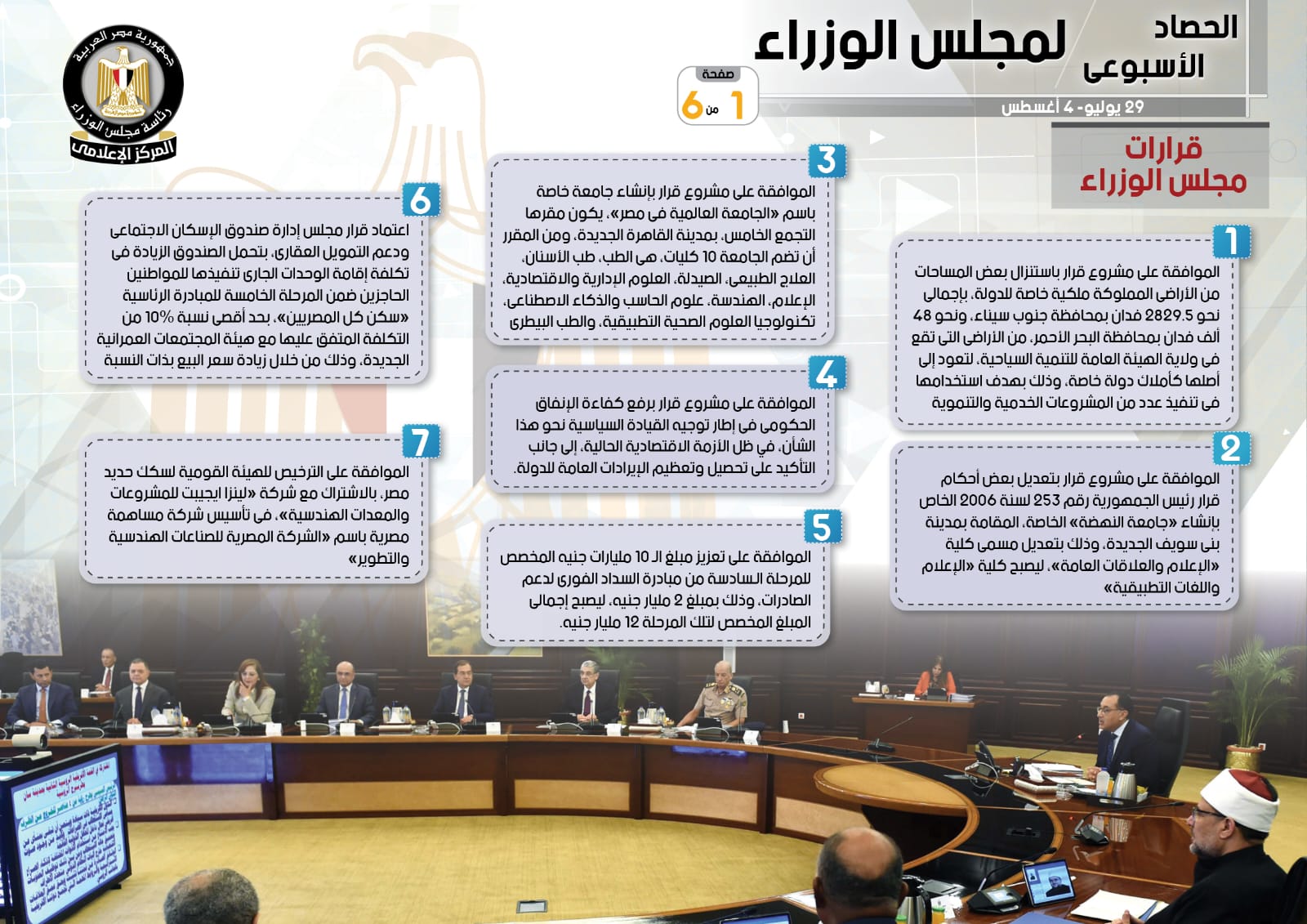 وجاء في التقرير أنه تم إصدار عدد من القرارات وتشمل الموافقة على مشروع قرار باستنزال بعض المساحات من الأراضي المملوكة ملكية خاصة للدولة، بإجمالي نحو 2829.5 فدان بمحافظة جنوب سيناء، ونحو 48 ألف فدان بمحافظة البحر الأحمر، من الأراضي التي تقع في ولاية الهيئة العامة للتنمية السياحية، لتعود إلى أصلها كأملاك دولة خاصة، وذلك بهدف استخدامها في تنفيذ عدد من المشروعات الخدمية والتنموية، بالإضافة إلى الموافقة على مشروع قرار بتعديل بعض أحكام قرار رئيس الجمهورية رقم 253 لسنة 2006 الخاص بإنشاء "جامعة النهضة" الخاصة، المقامة بمدينة بنى سويف الجديدة، وذلك بتعديل مسمى كلية "الإعلام والعلاقات العامة"، ليصبح كلية "الإعلام واللغات التطبيقية"، فضلاً عن الموافقة على مشروع قرار بإنشاء جامعة خاصة باسم "الجامعة العالمية في مصر"، يكون مقرها التجمع الخامس، بمدينة القاهرة الجديدة، ومن المقرر أن تضم الجامعة 10 كليات، هي الطب، طب الأسنان، العلاج الطبيعي، الصيدلة، العلوم الإدارية والاقتصادية، الإعلام، الهندسة، علوم الحاسب والذكاء الاصطناعي، تكنولوجيا العلوم الصحية التطبيقية، والطب البيطري، وكذلك الموافقة على مشروع قرار برفع كفاءة الإنفاق الحكومي في إطار توجيه القيادة السياسية نحو هذا الشأن، في ظل الأزمة الاقتصادية الحالية، إلى جانب التأكيد على تحصيل وتعظيم الإيرادات العامة للدولة، إلى جانب الموافقة على تعزيز مبلغ الـ 10 مليارات جنيه المخصص للمرحلة الـسادسة من مبادرة السداد الفوري لدعم الصادرات، وذلك بمبلغ 2 مليار جنيه، ليصبح إجمالي المبلغ المخصص لتلك المرحلة 12 مليار جنيه.