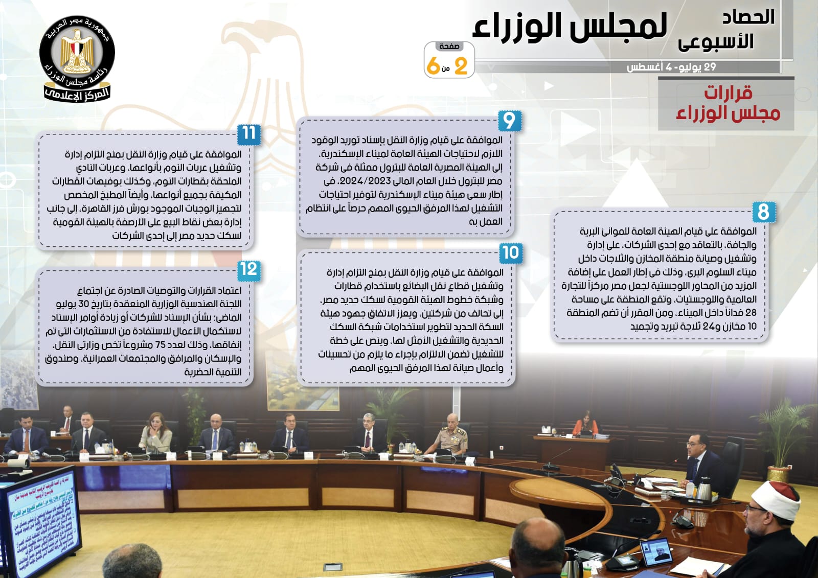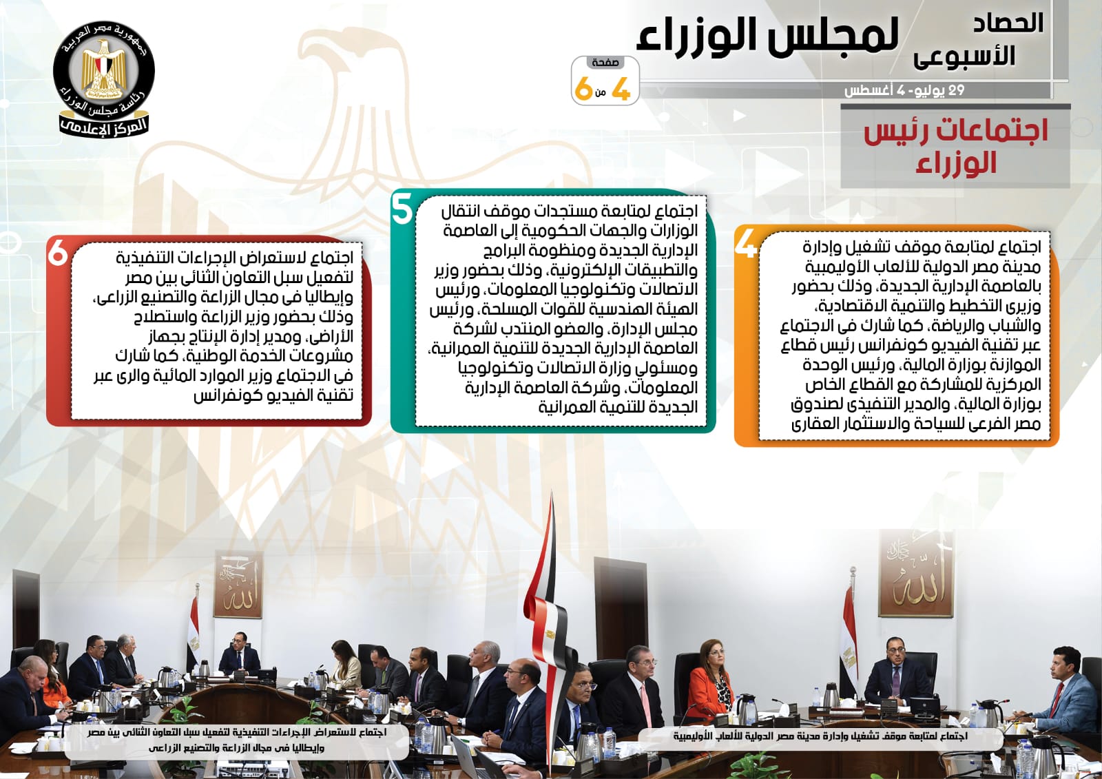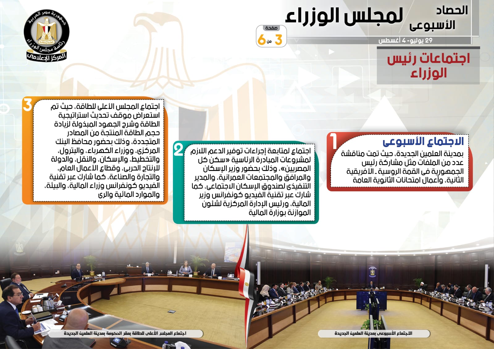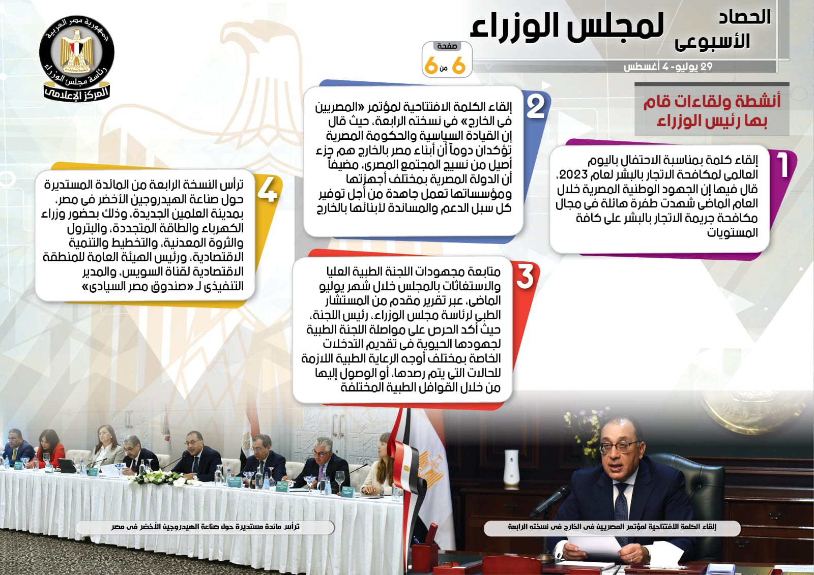 نشر المركز الإعلامي لمجلس الوزراء، تقريراً شمل إنفوجرافات سلط من خلالها الضوء على الحصاد الأسبوعي لمجلس الوزراء، وذلك خلال الفترة من29 يوليو حتى4 أغسطس 2023، والذي تضمن الموافقة على عدد من القرارات، فضلاً عن الاجتماعات التي عقدها الدكتور مصطفى مدبولي، رئيس مجلس الوزراء، بالإضافة إلى ما قام به من أنشطة.