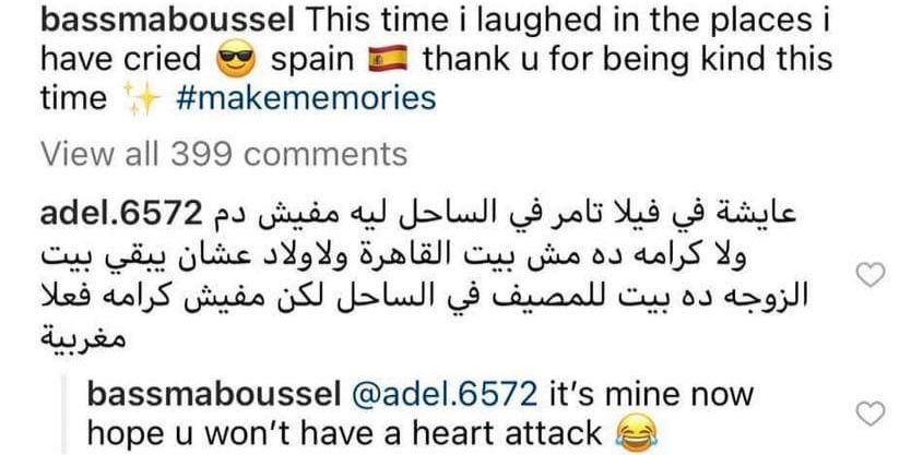 وكتب أحد المتابعين على صورة بسمة بوسيل عبر "انستجرام" معلقة:"عايشة في فيلا تامر حسني في الساحل ليه؟ مفيش دم ولا كرامة دا مش بيت القاهرة ولا ولاد عشان يبقى بيت الزوجة دا بيت للمصيف في الساحل".