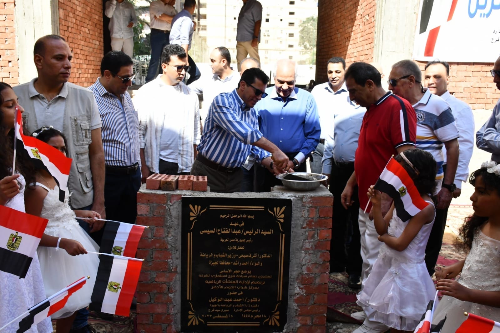 أشرف صبحي ومحافظ الجيزة يضعان حجر الاساس لحمام سباحة بمركز الشباب الدولى