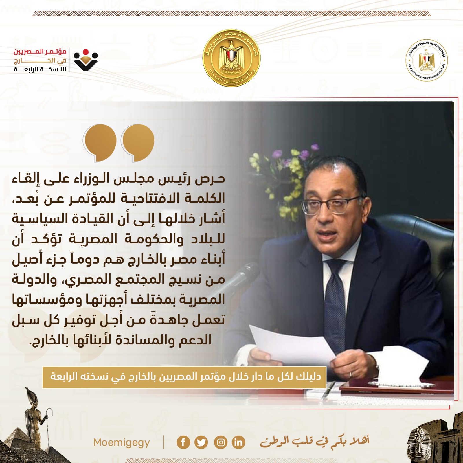 في مستهل المؤتمر، حرص رئيس مجلس الوزراء، على إلقاء الكلمة الافتتاحية للمؤتمر عن بُعد، أشار خلالها إلى أن القيادة السياسية للبلاد والحكومة المصرية تؤكدان دومًا أن أبناء مصر بالخارج هم جزء أصيل من نسيج المجتمع المصري، مشيرًا إلى أن الدولة المصرية بمختلف أجهزتها ومؤسساتها تعمل جاهدةً من أجل توفير كل سبل الدعم والمساندة لأبنائها بالخارج.