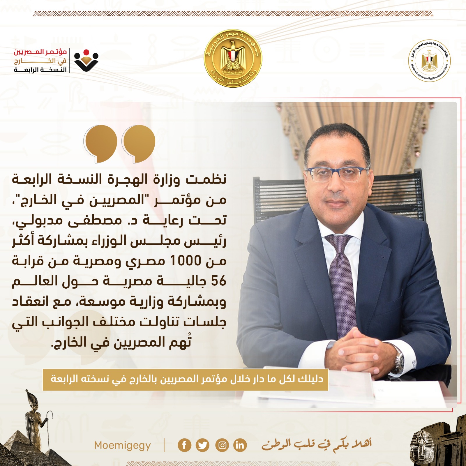 نظمت وزارة الدولة للهجرة وشئون المصريين في الخارج، يوم الإثنين الماضي، أكبر نسخ مؤتمرات المصريين في الخارج، تحت رعاية الدكتور مصطفى مدبولي، رئيس مجلس الوزراء، بمشاركة أكثر من 1000 مصري ومصرية من قرابة 56 جالية حول العالم، بمشاركة وزارية موسعة، مع انعقاد جلسات تناولت مختلف الجوانب التي تُهم المصريين في الخارج.