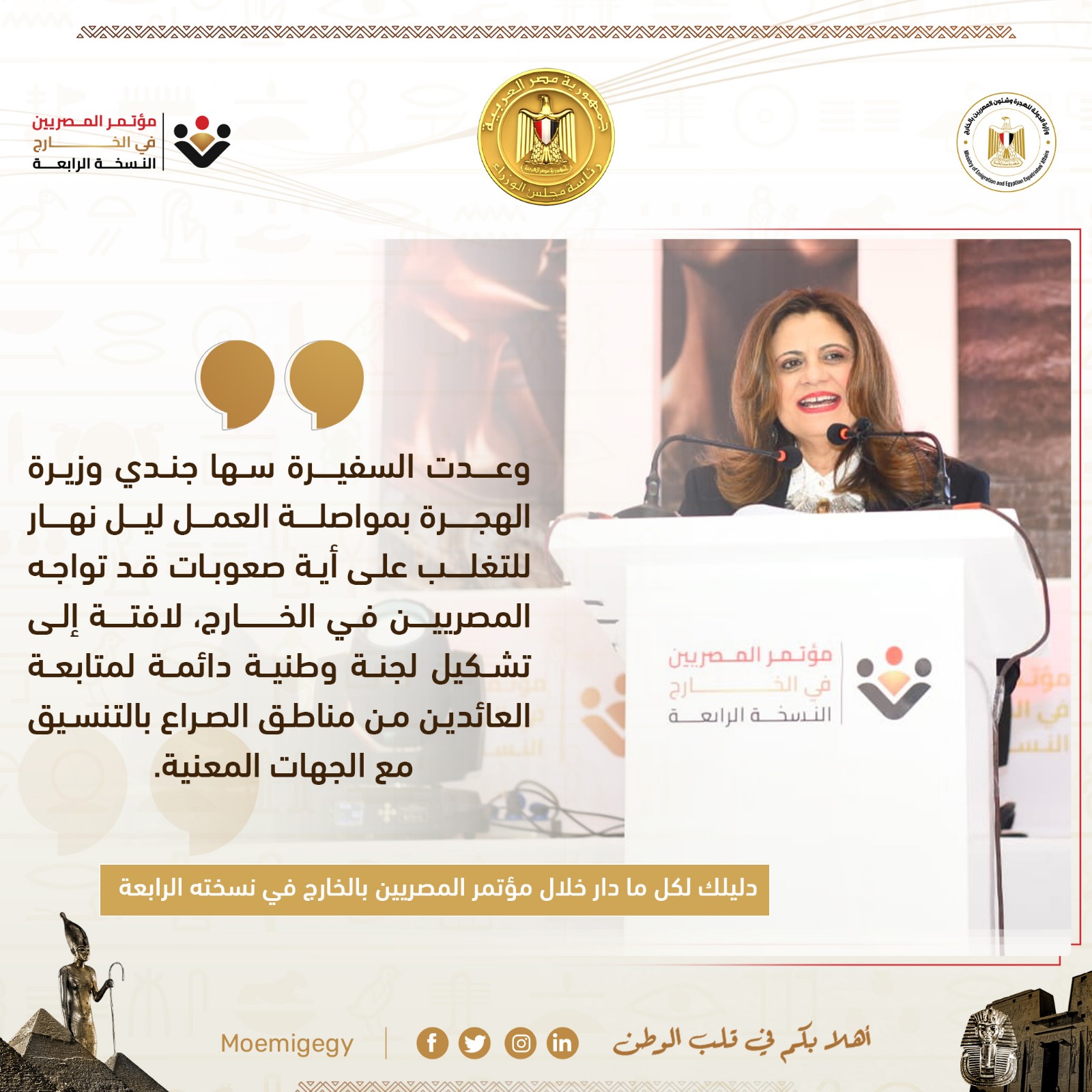 وأكدت السفيرة سها جندي، وزيرة الدولة للهجرة وشئون المصريين في الخارج، أن الرئيس عبد الفتاح السيسي، رئيس الجمهورية، حريص على رعاية أبناء مصر في أي مكان وفي مختلف الظروف، لافتًا إلى أن النسخة الرابعة لمؤتمر المصريين في الخارج هذا العام كان بمثابة «حوار من القلب»، مؤكدة فخرها بما لمسته من نتائج إيجابية خلال التعاون أبناء الوطن في الخارج مع بلادهم لدعم جهود التنمية.