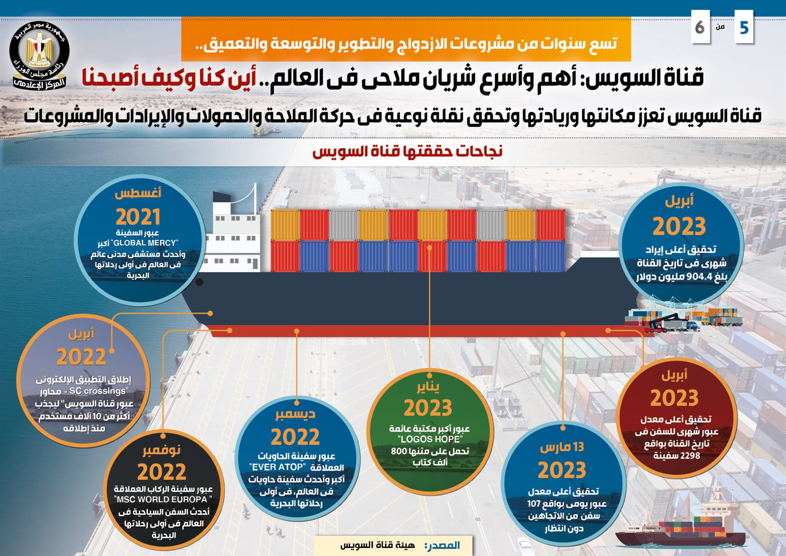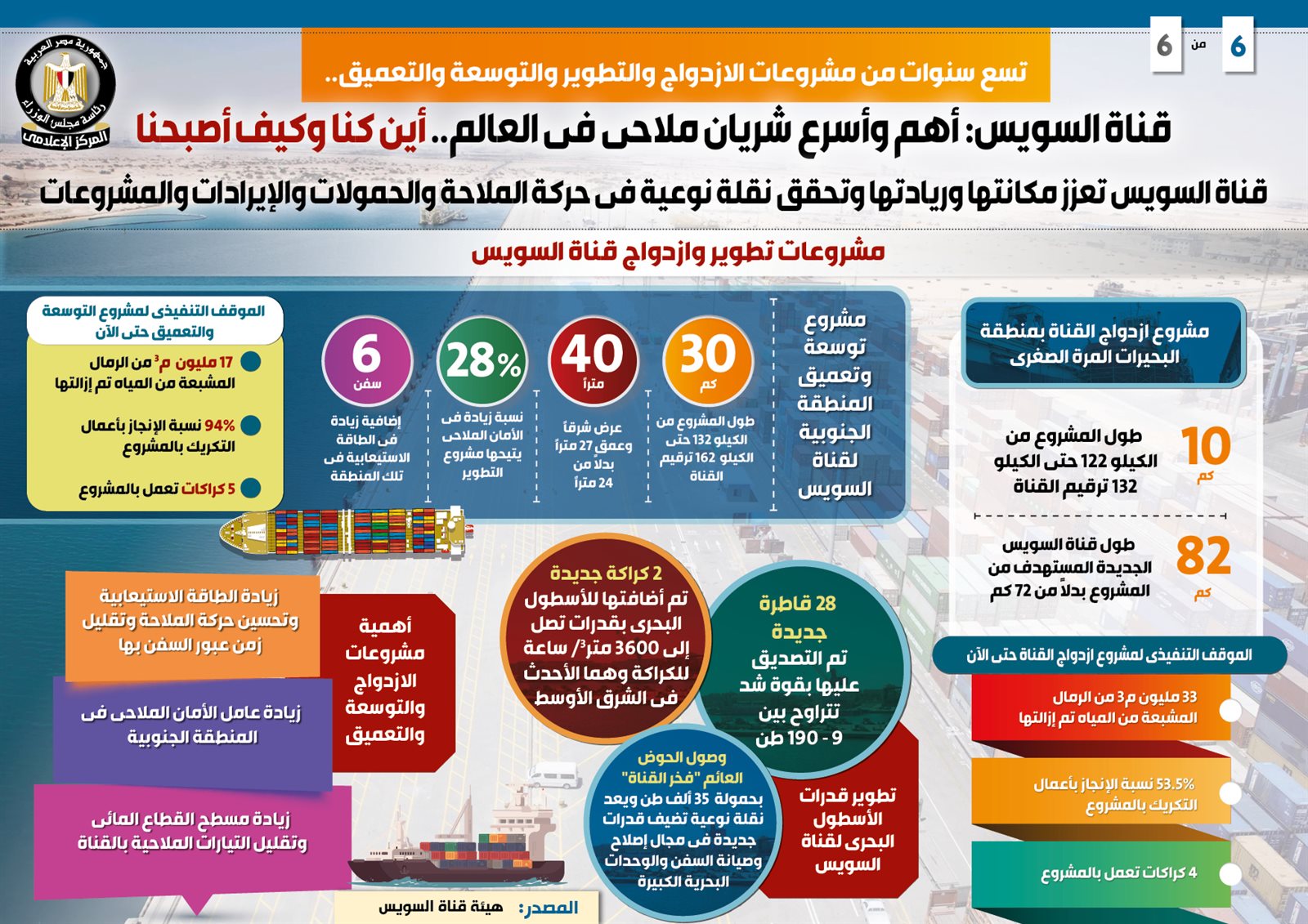 وفي هذا الصدد نشر المركز الإعلامي لمجلس الوزراء تقريراً ضمن سلسلة "أين كنا وكيف أصبحنا"، تضمن إنفوجرافات تسلط الضوء على قناة السويس كأهم وأسرع شريان ملاحي في العالم، بفضل تسع سنوات من مشروعات الازدواج والتطوير والتوسعة والتعميق، لتنجح في تعزيز مكانتها وريادتها وتحقق نقلة نوعية في حركة الملاحة والحمولات والإيرادات والمشروعات.