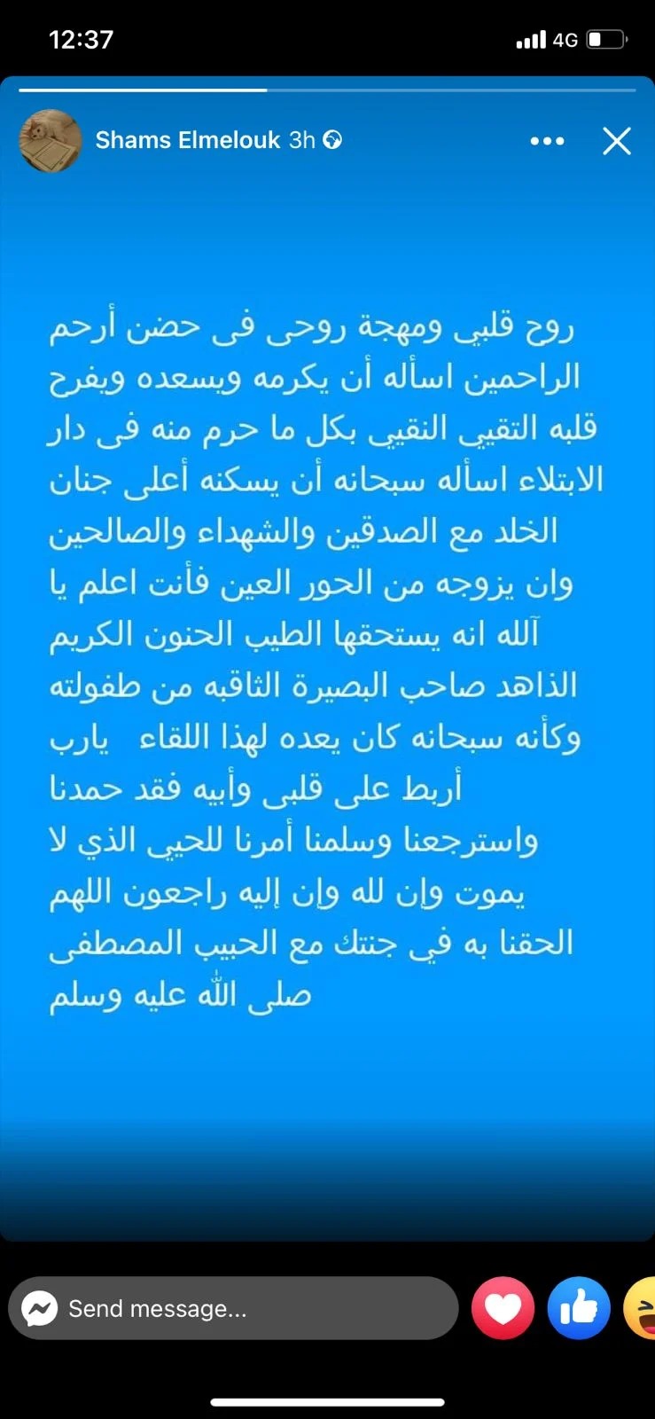 تابعت:" يارب أربط على قلبى وأبيه فقد حمدنا واسترجعنا وسلمنا أمرنا للحيي الذي لا يموت وإن لله وإن إليه راجعون اللهم الحقنا به في جنتك مع الحبيب المصطفى صلى الله عليه وسلم".