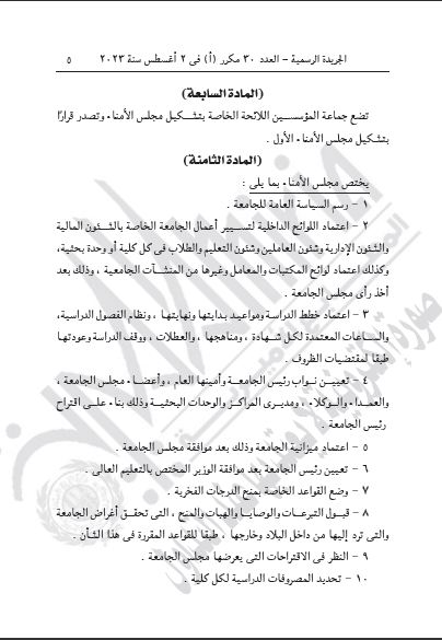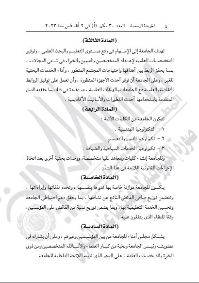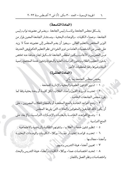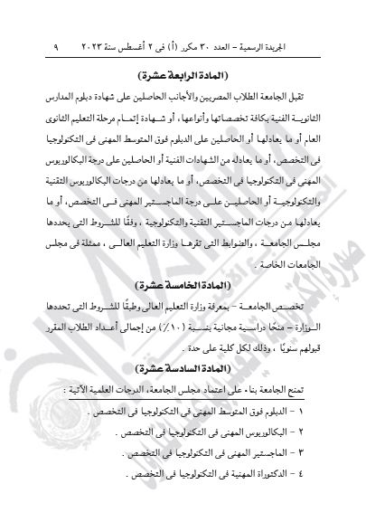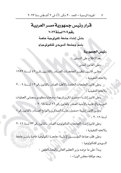 نشرت الجريدة الرسمية في عددها الصادراليوم تصديق رئيس الجمهورية عبدالفتاح السيسي، على القرار رقم 209 لسنة 2023 بشأن إنشاء جامعة تكنولوجية خاصة باسم "جامعة السويدي للتكنولوجيا".