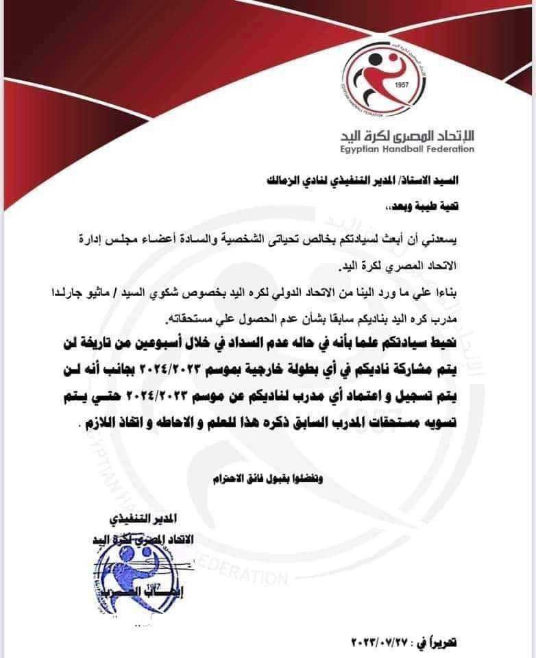 وجاء نص الخطاب الذي أرسله اتحاد اليد لنادي الزمالك يوم 27 يوليو الماضي، كما يلي: "بناءً على ما ورد إلينا من الاتحاد الدولي لكرة اليد بخصوص شكوى ماتيو جارالدا مدرب كرة اليد بناديكم سابقا بشأن عدم الحصول على مستحقاته، نحيططك علما بأنه في حالة عدم السداد في خلال أسبوعين من تاريخه لن يتم مشاركة ناديكم في أي بطولة خارجية بموسم 2023-2024، بجانب أنه لن يتم تسجيل واعتماد أي مدرب لناديكم عن موسم 2023-2024، حتى يتم تسوية مستحقات المدرب السابق ذكره".