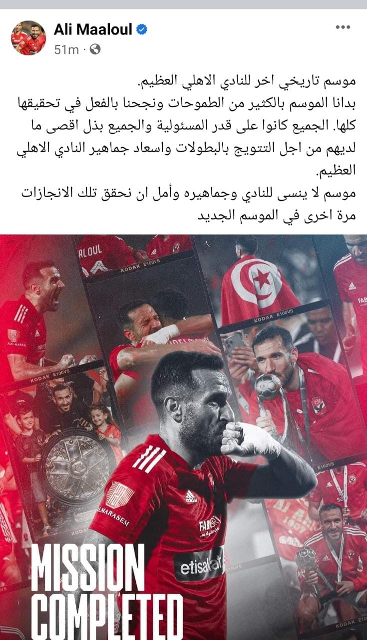 وكتب علي معلول عبر صفحته الشخصية على "فيسبوك": "موسم تاريخي اخر للنادي الاهلي العظيم.