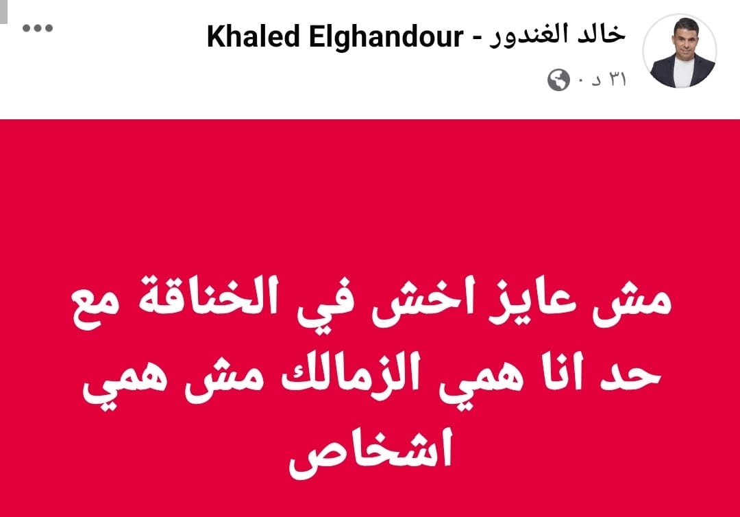 وجه خالد الغندور، نجم الزمالك الأسبق، رسالة غامضة عبر صفحته الرسمية بموقع "فيس بوك"، قائلاً "مش عايز أخش في الخناقة مع حد أنا همي الزمالك مش همي أشخاص".
