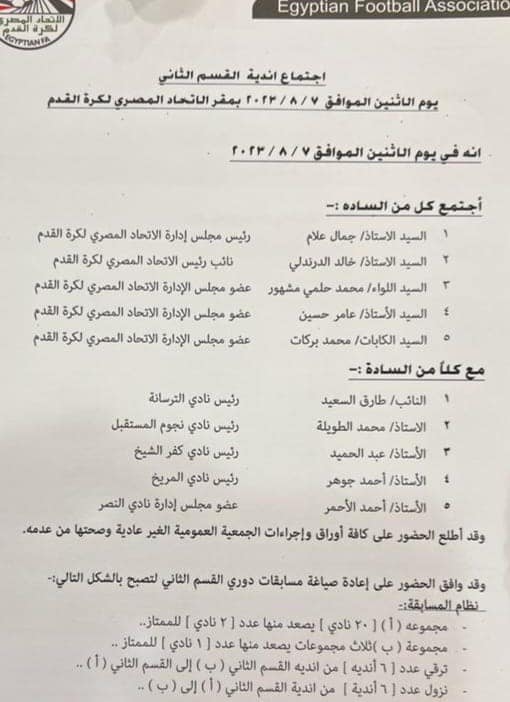 عقد مجلس إدارة اتحاد الكرة برئاسة جمال علام جلسة مساء اليوم مع عدد من رؤساء أندية القسم الثاني، وذلك لحسم مصير بطولة دوري المحترفين.