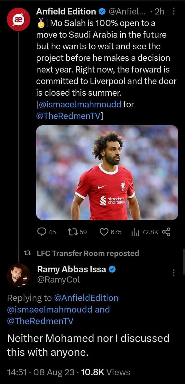 ونشر أحد الحسابات المختصة بتغطية أخبار فريق ليفربول عبر منصة "تويتر"، أن محمد صلاح منفتح في الوقت الحالي على الانتقال لبطولة الدوري السعودي في المستقبل، ولكنه يريد الانتظار ورؤية المشروع قبل اتخاذ قراره في الموسم المقبل، مؤكدًا أنه في الوقت الحالي اللاعب ملتزم مع "الريدز" وأغلق باب الانتقالات هذا الصيف، ورد رامي عباس على هذه التدوينة قائلًا: "لم نتناقش أنا أو محمد صلاح في هذا الأمر مع أي شخص".