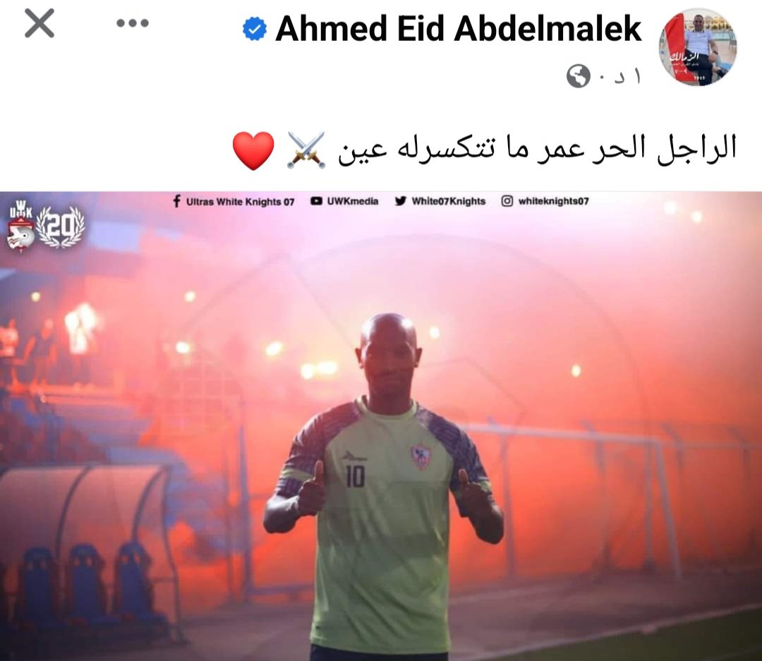 ونشر أحمد عيد عبر صفحته الرسمية على موقع التواصل الاجتماعي، صورة لـ شيكابالا وكتب عليها: "الراجل الحر عمر ما تتكسرله عين".