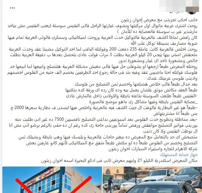حذر مواطن من شراء سيارة من إحدى المعارض المعتمدة لبيع السيارات موثقا تجربته قائلا " حابب احكى تجربتى مع معرض إخوان زيتون روحت اشترى عربية مانوال اول مركبتها وبشوف غيارتها الراجل قالى الفتيس سوستة (يعنى الفتيس مش بياخد مارشدير غير ب سوستة فالعصاية ده للأمان ) كان رافض تمامًا اكشف عالعربية فالتوكيل خدت العربية وروحت لميكانيكى وسمكرى قالولى العربية تمام فيها شوية مصاريف بسيطة توكل على الله ".