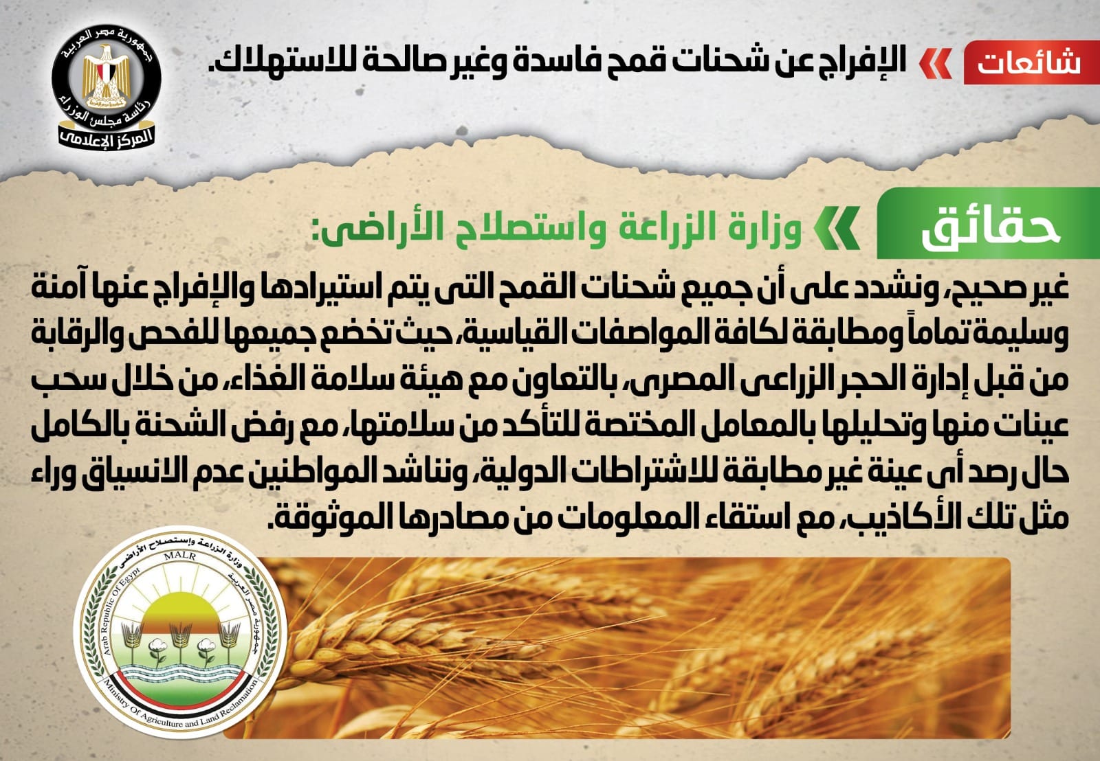 قام المركز الإعلامي لمجلس الوزراء بالتواصل مع وزارة الزراعة واستصلاح الأراضي، والتي نفت تلك الأنباء، مُؤكدةً أنه لا صحة للإفراج عن شحنات قمح فاسدة أو غير صالحة للاستهلاك.