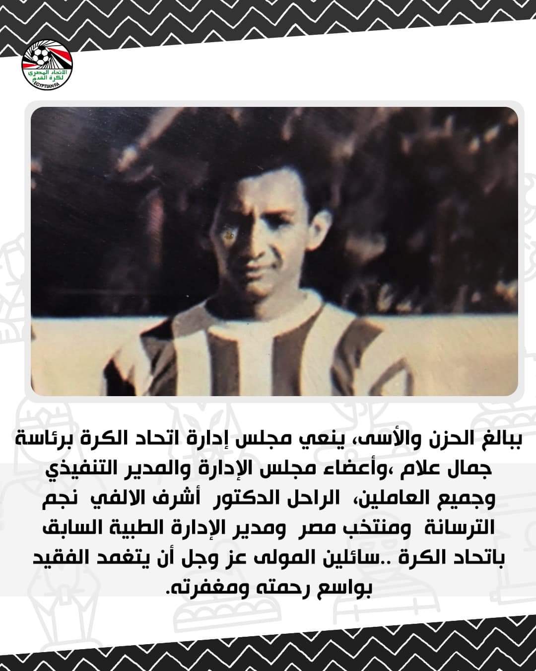 ونشرت الصفحة الشخصية لاتحاد الكرة عبر فيسبوك: ببالغ الحزن والأسى، ينعي مجلس إدارة اتحاد الكرة برئاسة جمال علام ،وأعضاء مجلس الإدارة والمدير التنفيذي وجميع العاملين، الراحل الدكتور أشرف الالفي نجم الترسانة ومنتخب مصر ومدير الإدارة الطبية السابق باتحاد الكرة ..سائلين المولى عز وجل أن يتغمد الفقيد بواسع رحمته ومغفرته.
