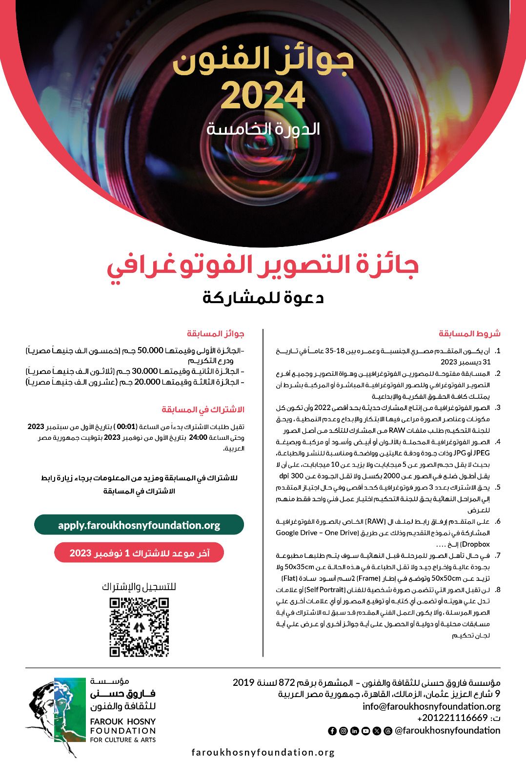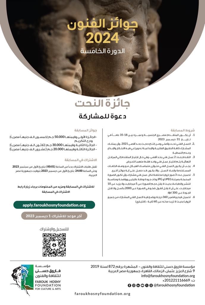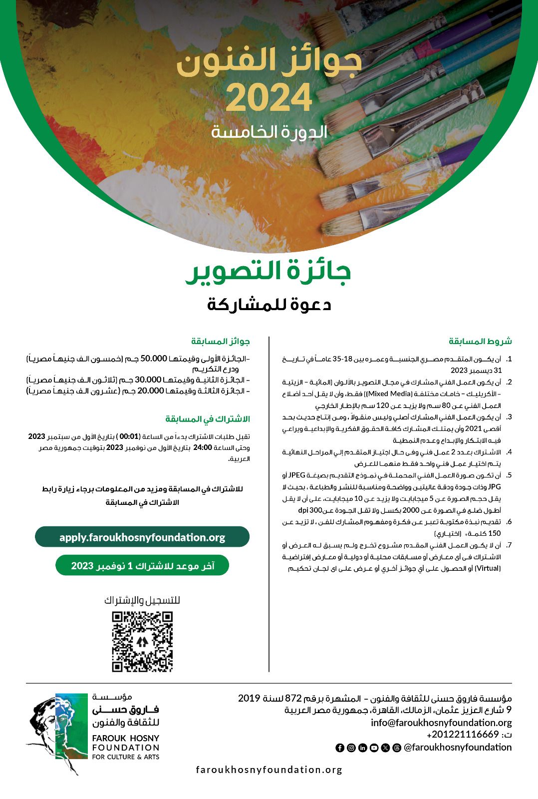 أعلنت مؤسسة فاروق حسني للثقافة والفنون عن شروط الاشتراك في جوائز الفنون الدورة الخامسة لعام 2024 في مجالات ( التصوير "الرسم" – العمارة – النحت – النقد الفني التشكيلي – التصوير الفوتوغرافي ) .
