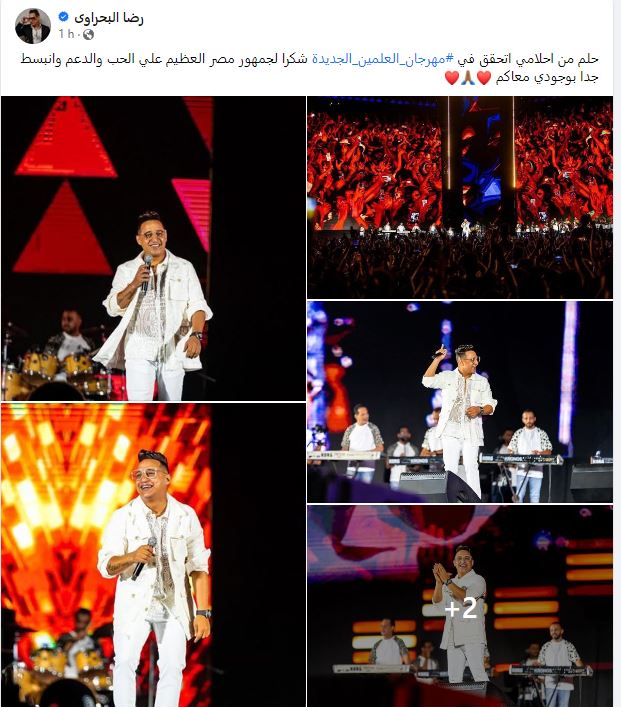 ونشر رضا البحراوي عدد من الصور والفيديوهات له خلال الحفل عبر حسابه على "فيسبوك"، معلقًا عليها: "حلم من أحلامي اتحقق في مهرجان العلمين الجديدة شكرًا لجمهور مصر العظيم على الحب والدعم وانبسطت جدًا بوجودي معاكم".