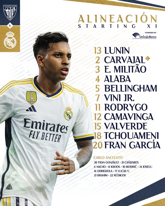 فينيسيوس ورودريجو يقودان هجوم ريال مدريد ضد أتلتيك بيلباو ولونين يعوض كورتوا