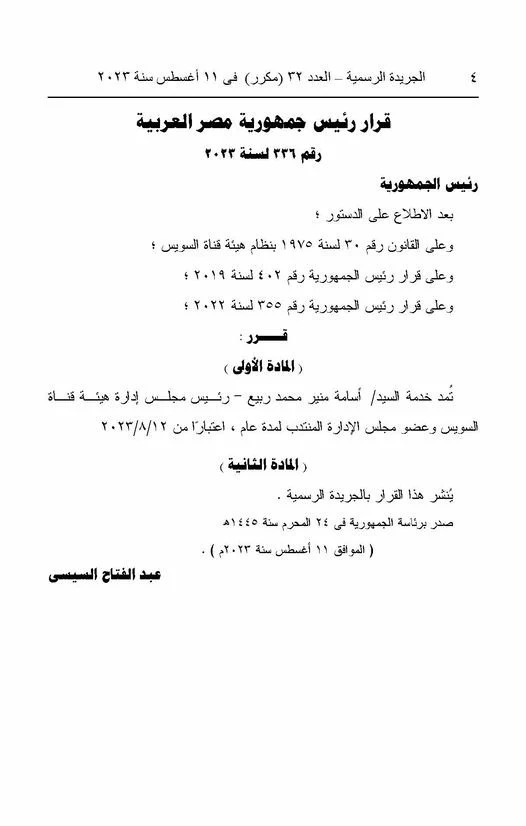 نشرت جريدة الوقائع المصرية "الجريدة الرسمية"، في عددها الصادر اليوم الأحد، قرار الرئيس عبد الفتاح السيسي، رئيس الجمهورية رقم 336 لسنة 2023 بمد خدمة الفريق أسامة ربيع رئيس مجلس إدارة هيئة قناة السويس وعضو مجلس الإدارة المنتدب لمدة عام، اعتبارًا من 12 أغسطس الجاري.