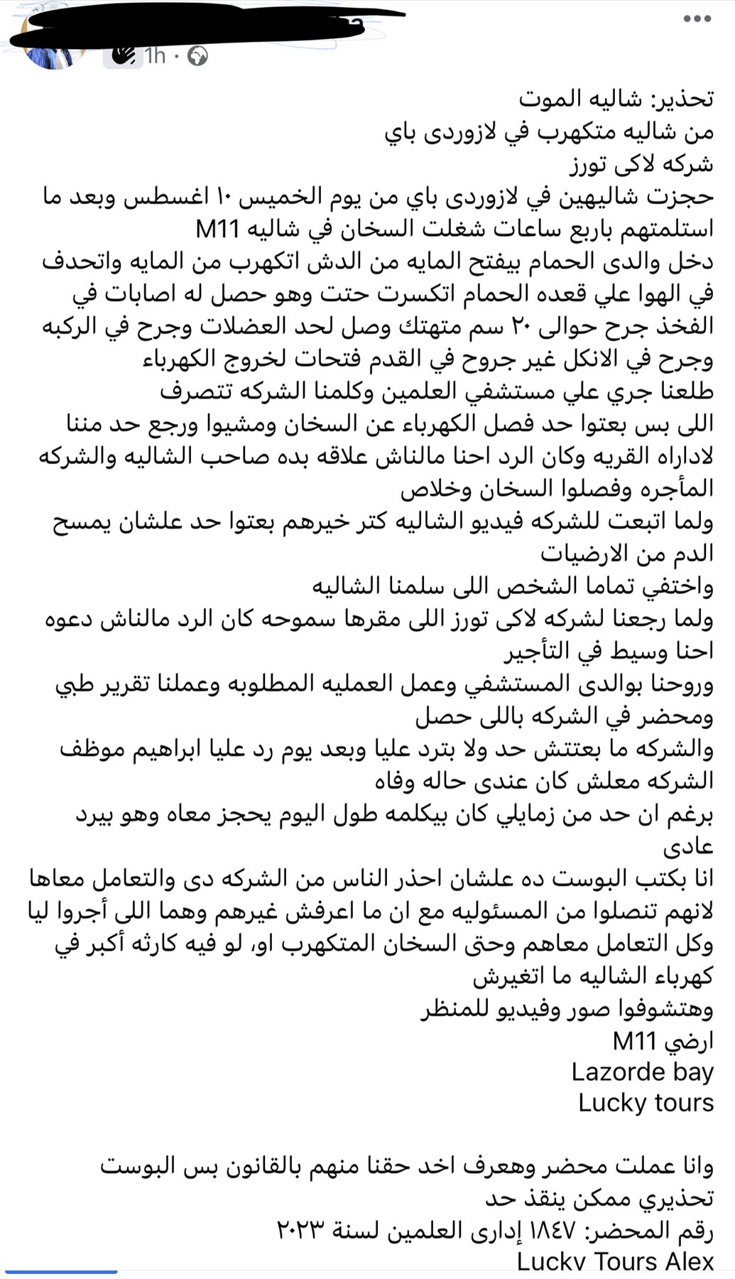 وقال" ولما رجعنا لشركه لاكى تورز اللى مقرها سموحه كان الرد مالناش دعوه احنا وسيط في التأجير وروحنا بوالدى المستشفي وعملالعمليه المطلوبه وعملنا تقرير طبي ومحضر في الشركه باللى حصل والشركه ما بعتتش حد ولا بترد عليا وبعد يوم رد عليا ابراهيم موظفالشركه معلش كان عندى حاله وفاه برغم ان حد من زمايلي كان بيكلمه طول اليوم يحجز معاه وهو بيرد عادى انا بكتب البوست ده علشاناحذر الناس من الشركه دى والتعامل معاها لانهم تنصلوا من المسئوليه مع ان ما اعرفش غيرهم وهما اللى أجروا ليا وكل التعامل معاهموحتى السخان المتكهرب او، لو فيه كارثه أكبر في كهرباء الشاليه ما اتغيرش".